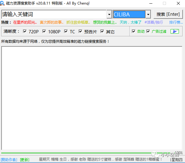一款由吾爱论坛网友分享的磁力资源搜索工具最佳的资源搜索引擎,基本上全网最新上映的电影,电视剧都能在这里搜到,初次使用时需要更新网络资源库,这里能够搜索到资源,影视、电影、学习资料…等多种类型资源,而且质量还是非常高。