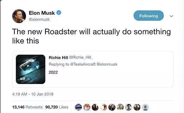 近日,特斯拉 CEO 埃隆·马斯克在 Twitter 上再度确认,特斯拉新一代跑车 Roadster 能够在地面上空盘旋(hover)。马斯克在推特上转发并回复了特斯拉粉丝发布的飞行汽车动图称,「新的 Roadster 就能做到这样。」