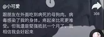 然后这些狗肉就会到了那些爱吃狗肉的人嘴里玉林狗肉节,某音上就有一个人发过自己吃了含有毒素的狗肉后,被感染,治疗一个月非常痛苦。