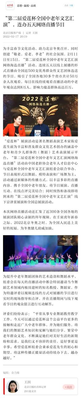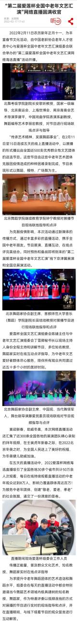 在中国2022农历新春之际,为丰富春节文化活动,助力北京冬奥顺利进行,遵照党和政府积极应对人口老龄化问题的国家战略政策,逐步改善中老年人群民生福祉的关键举措的指引下,中国老龄协会老年人才信息中心携手爱莲杯全国中老年文艺汇演组委会,践行“老有所为,老有所学,老有所乐,老有所依”的实际举措,共同联合举办的“第二届爱莲杯全国中老年文艺汇演优秀节目网络展播评选直播”活动圆满完成。