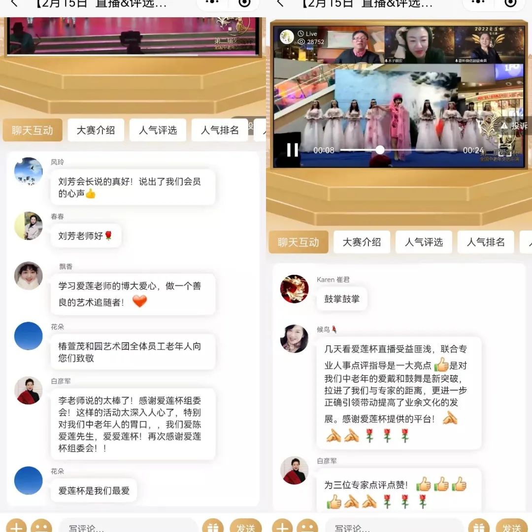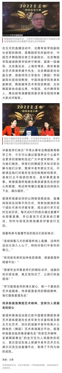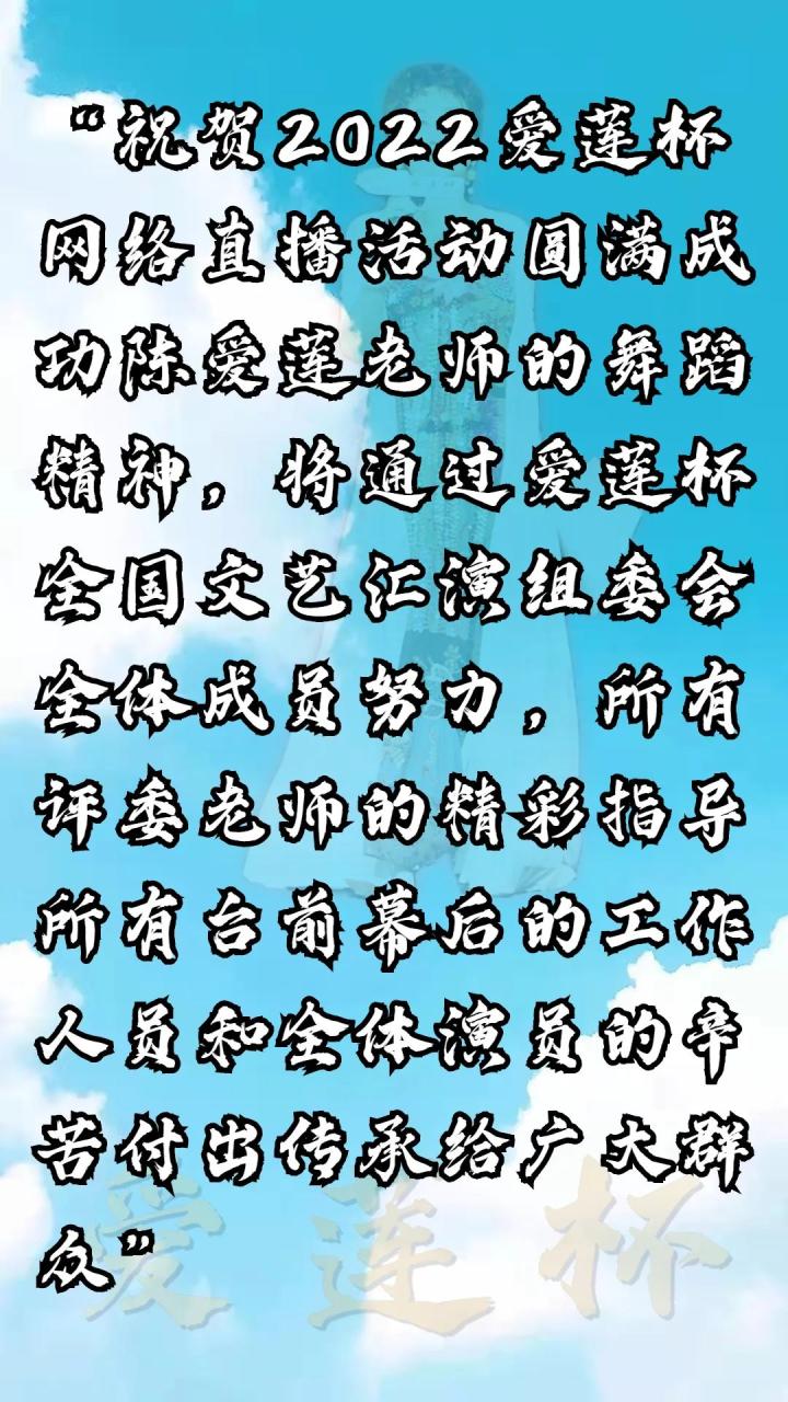 “组委会特别为大家组织开展的这次2022爱莲杯网络直播活动旨在让大家知道除了在线下舞台上的表演和展示以外,还有很多的诸如网络等形式、都是可以很好的展现自己的平台!