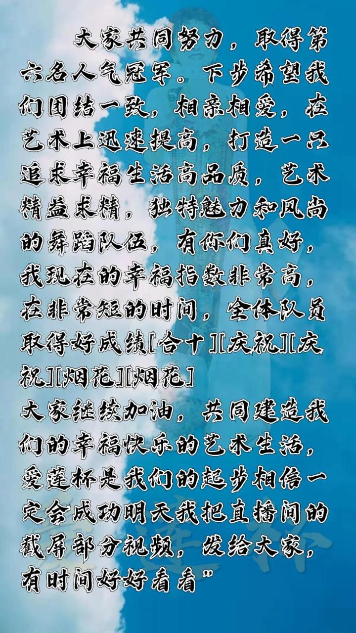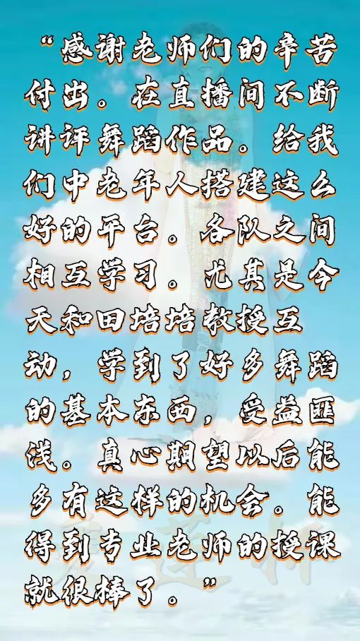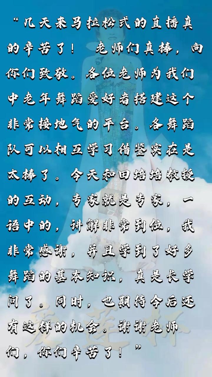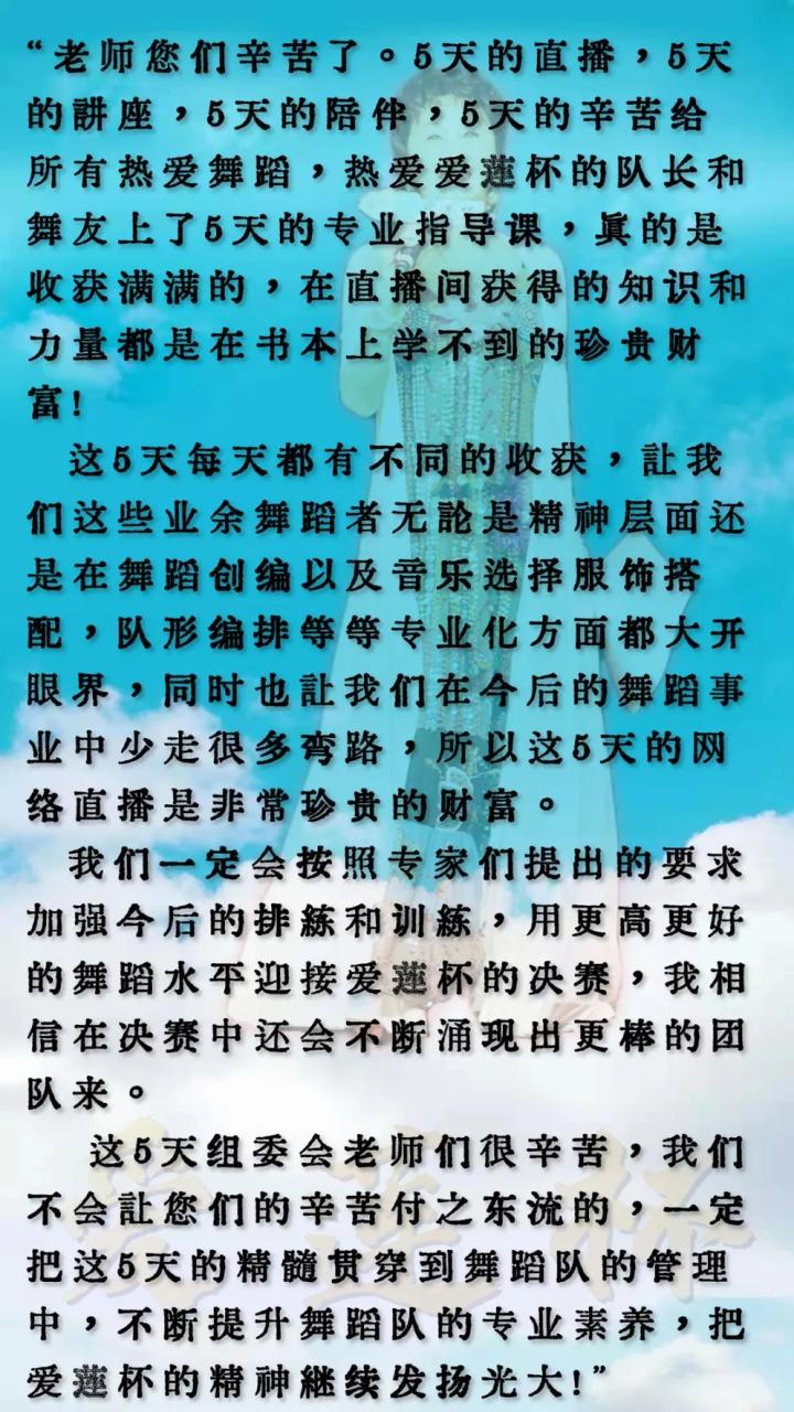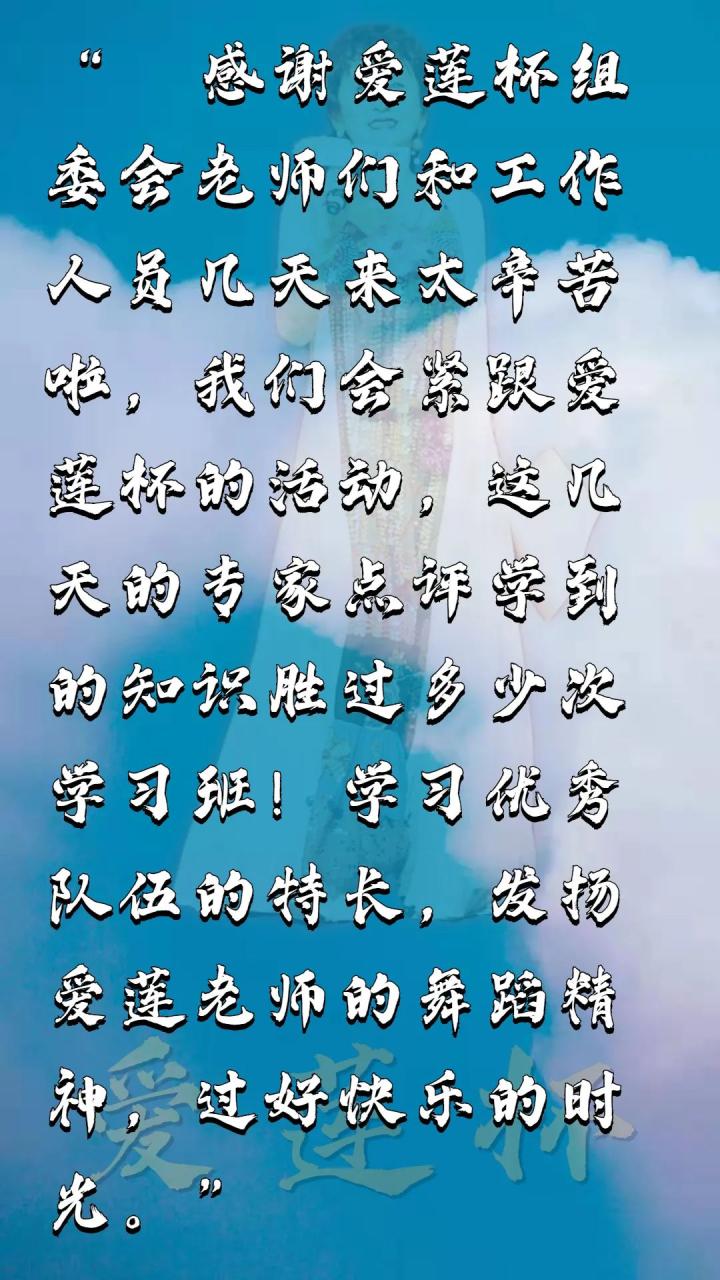 “老师您们辛苦了。5天的直播,5天的讲座,5天的陪伴,5天的辛苦给所有热爱舞蹈,热爱爱莲杯的队长和舞友上了5天的专业指导课,真的是收获满满的,在直播间获得的知识和力量都是在书本上学不到的珍贵财富!”