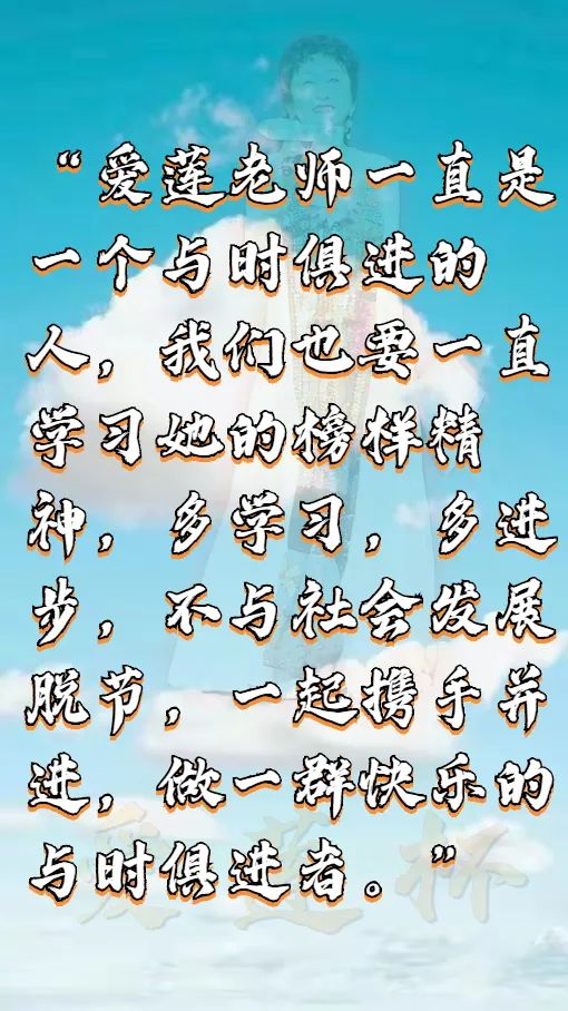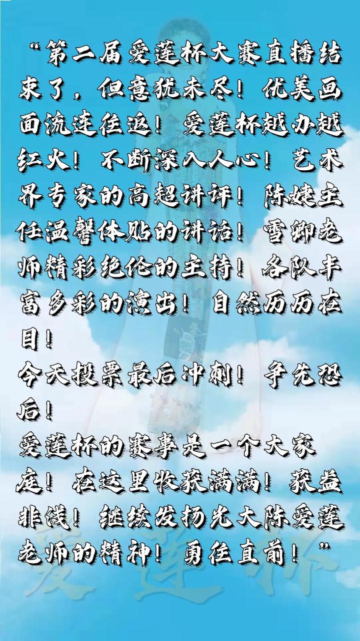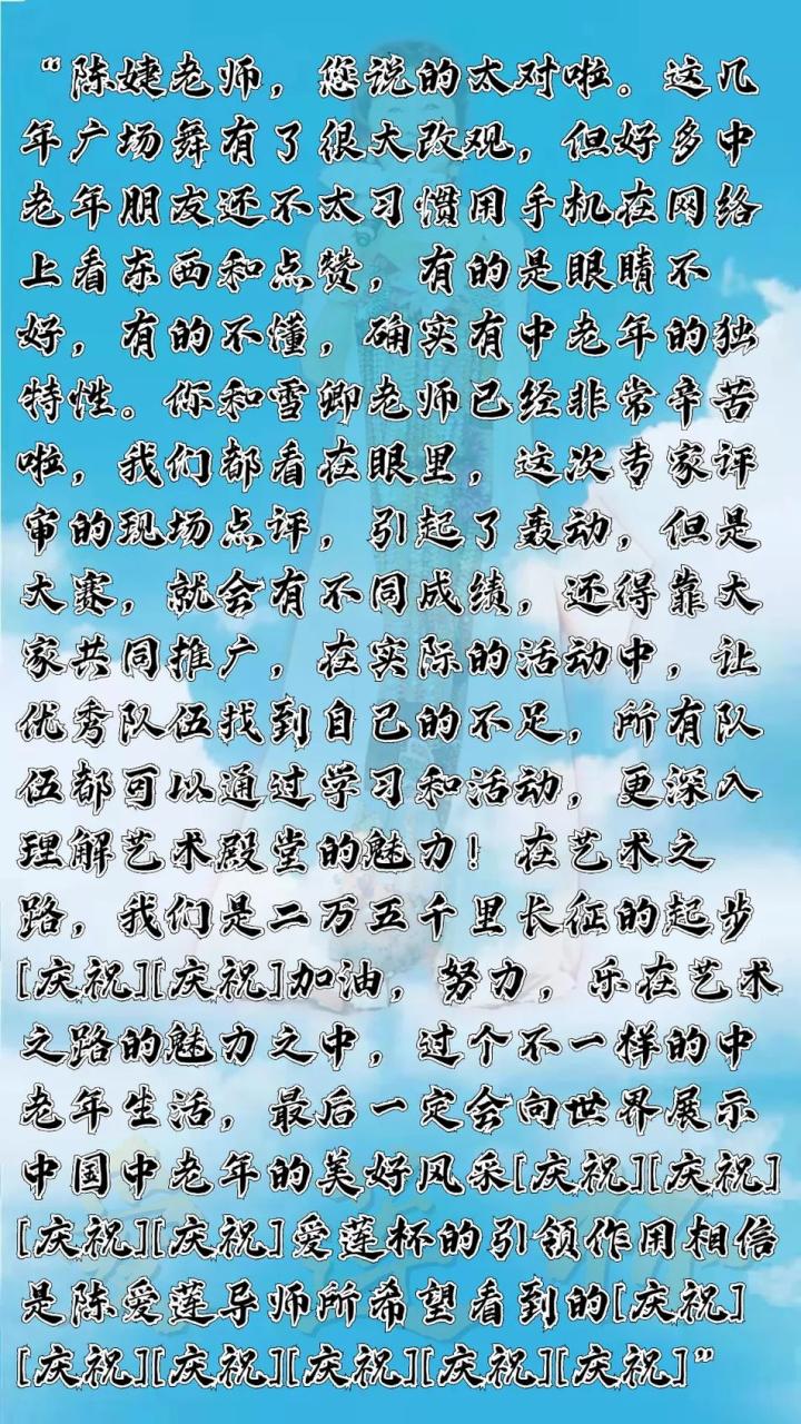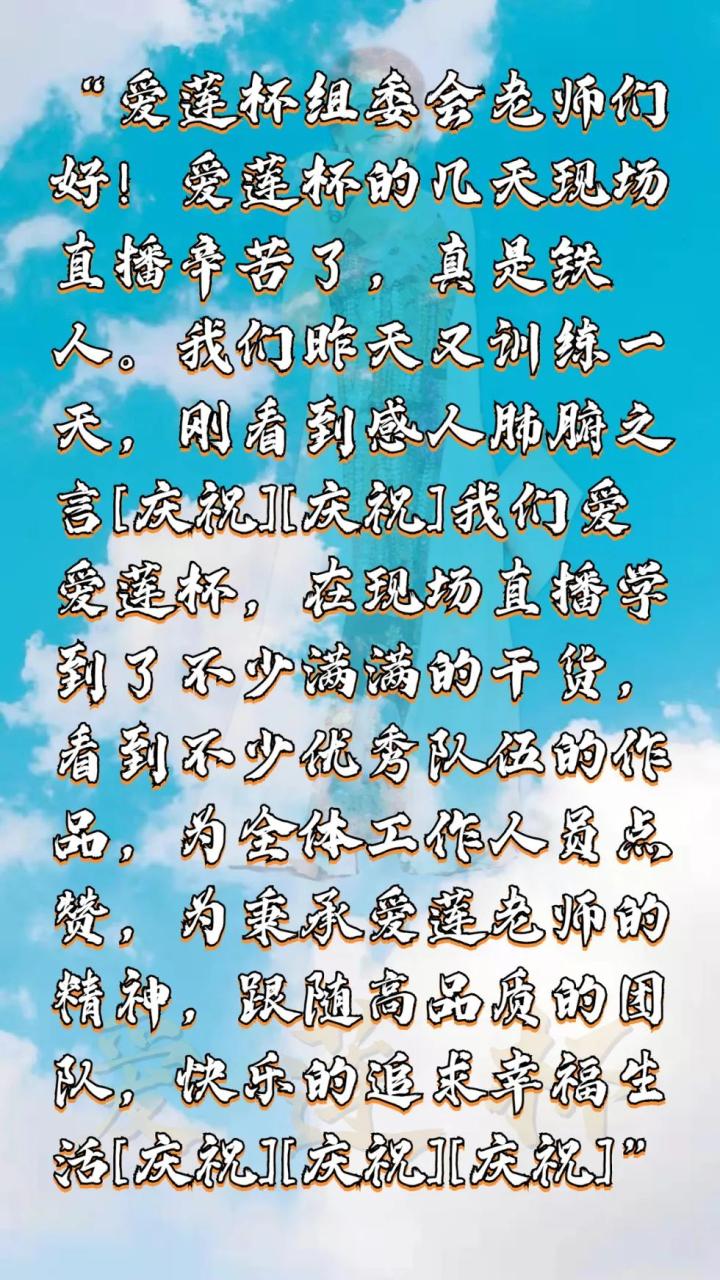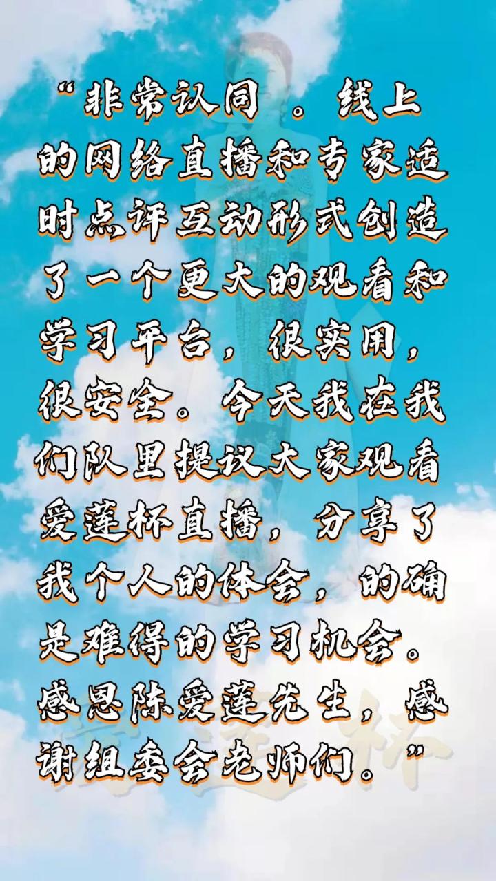 ““老师您好!爱莲杯真的太捧了!非常感谢我们的偶像陈爱莲老师为我们中老年搭建了这么好的平台,使我们的晚年生活丰富多彩。向陈爱莲老师致敬!我们要向爱莲老师那样活到老,学到老,把爱莲精神发扬光大!。”