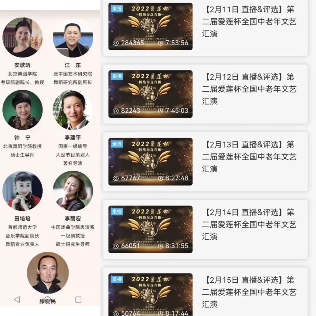 爱莲杯全国文艺汇演组委会陈婕主任与中老年文艺汇演组委会丁雪卿秘书长以现场主持人身份全程主持和讲解节目,多位知名教授、舞蹈家实时在线互动点评指导,为中老年文艺爱好者群体尽心服务,陪伴所有观众共同渡过近五十多个小时的美好时刻。