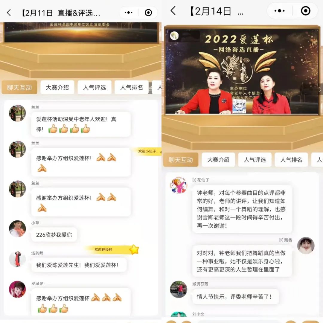 爱莲杯组委会始终秉承着爱莲先生“希望全民健康快乐的舞动起来,增进中老年朋友的交流与共同学习、提高、进步!!!”的全方位为人民服务的初心,首次尝试通过网络直播的方式,在线上给爱好舞蹈艺术的全国中老年搭建互相学习,互相交流的艺术平台,为群众艺术普及和共同进步创造展示机会。