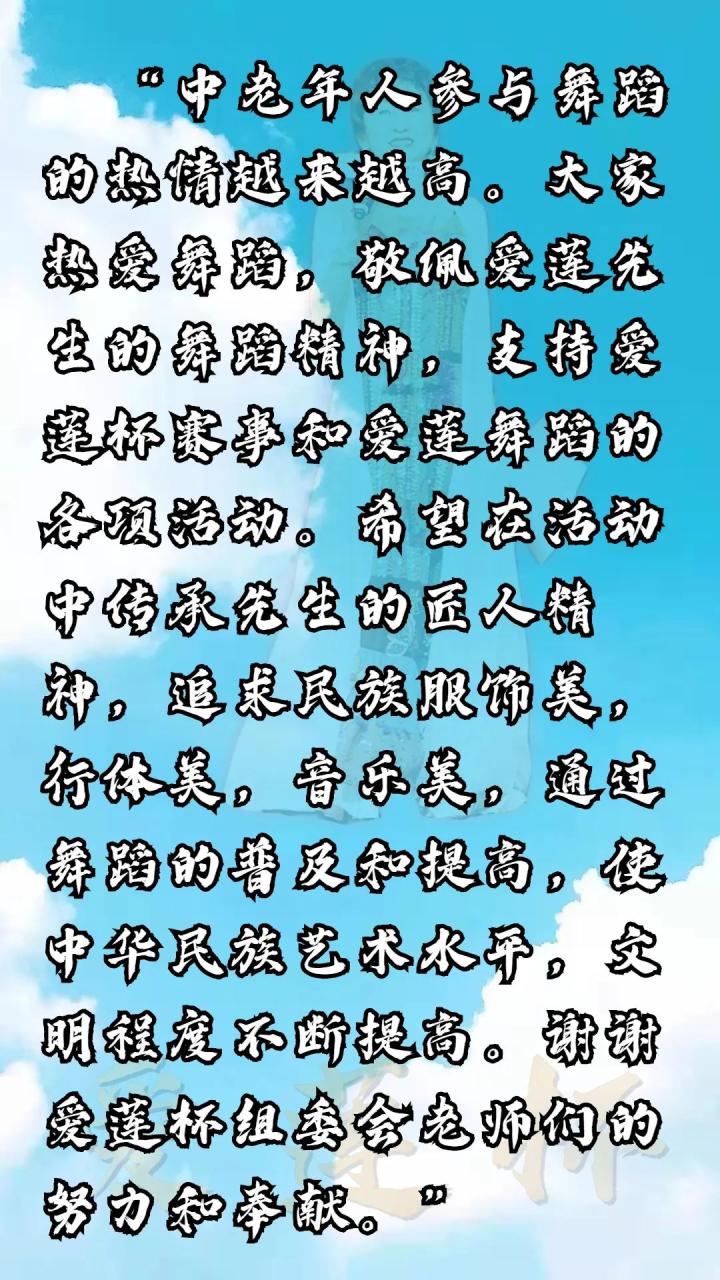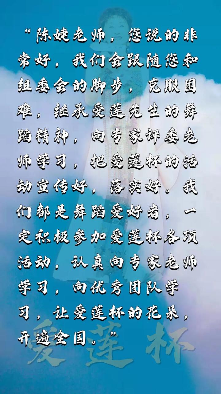 “平常从事专业舞蹈教育教学工作,今天可以通过爱莲杯这个公益平台更多的接触和走近广大中老年群体,并为她们服务,将我们的舞蹈艺术知识和见解与她们分享,繁荣中老年群众文化,不断满足她们对美好生活的新期盼和需求,是我们义不容辞的责任,是好事更是幸事。希望爱莲杯组委会秉承爱莲先生的初心和期望,将这种传播正能量活动持续办下去,越办越好。”