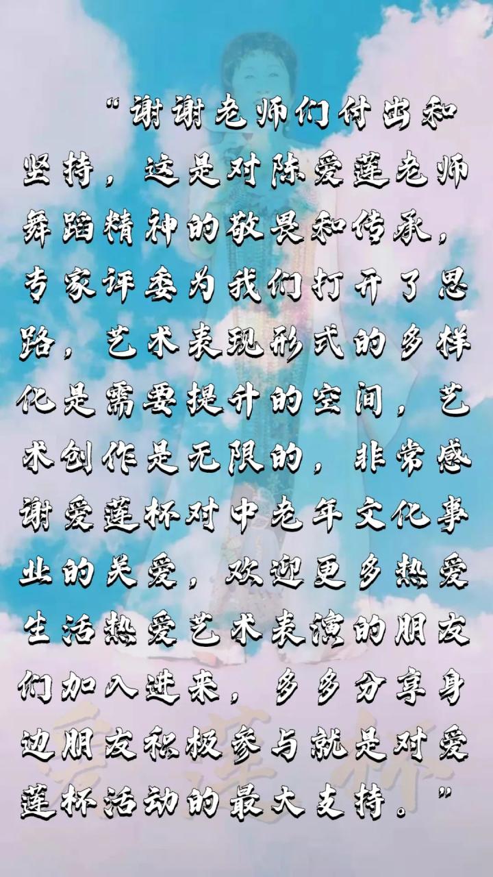“爱莲杯将会始终秉承着母亲陈爱莲创办“爱莲杯”的初衷,为广大的中老年艺术热爱者搭建一个良好的展示与交流的平台!