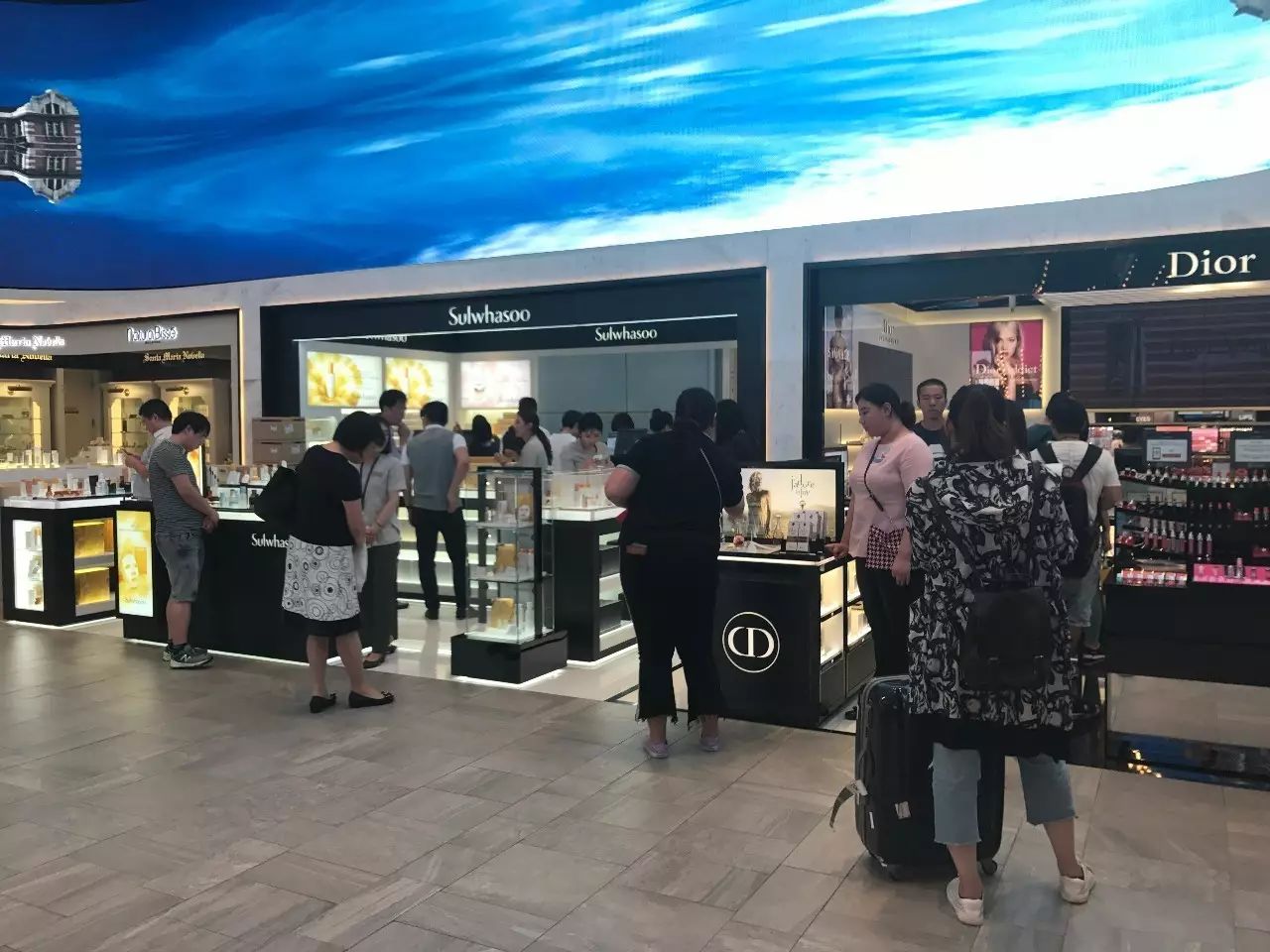 名牌高档箱包店面基本无人问津,在更受中国游客欢迎的化妆品柜台有一定数量的游客。一些较受欢迎化妆品柜台的地上摆放着一些包裹好的商品,据称是当天顾客购买后存下寄送的。