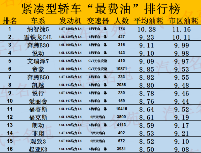 此次榜单根据网友们用车的实际油耗反馈得来,比较客观汽车油耗排行榜,此次榜单公布了轿车级别油耗排名的前30位,广大车友们可以了解和参考。