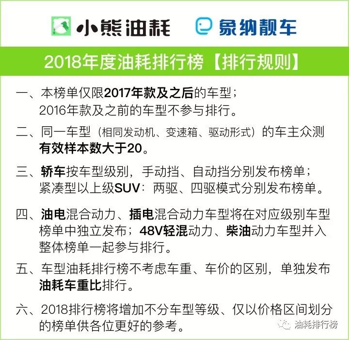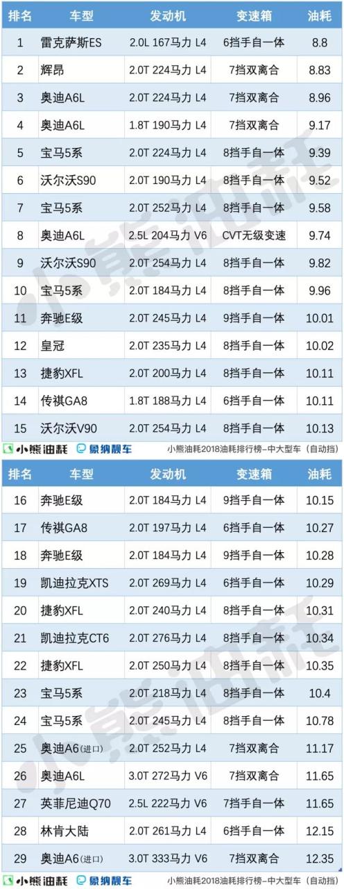 这个级别的车型油耗的重点应该不是油钱而是背后的环保意义,所以不设立推荐门槛汽车油耗排行榜,只能说在自己喜欢的车型中尽量选择油耗低的。