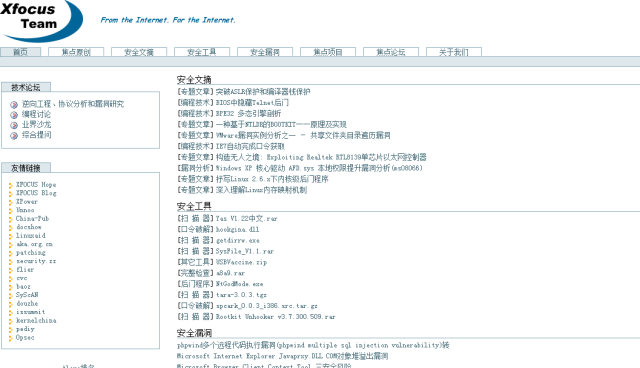 1999年由xundi创立,这里产生了很多技术大牛,X-Scan的作者也是该组织成员,包括从2002年开始一直开到现在的X-Con峰会,每年都会吸引大批国内外安全研究人员参加,Xfocus可以说是最早接近世界的黑客网站。