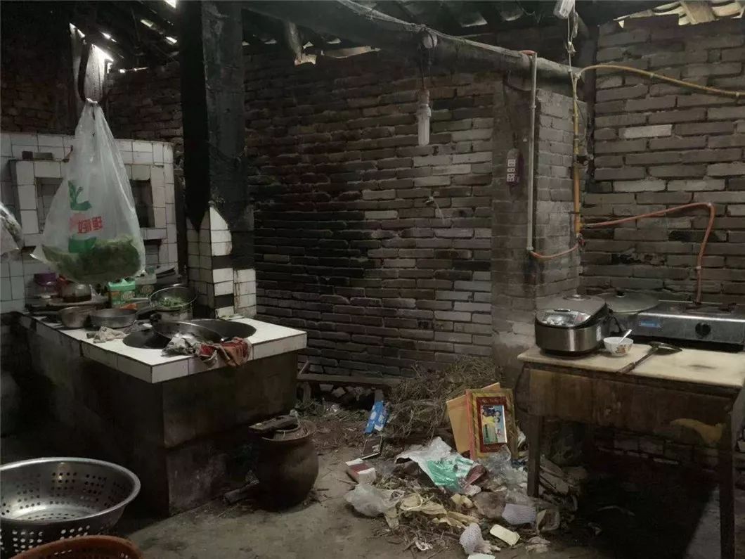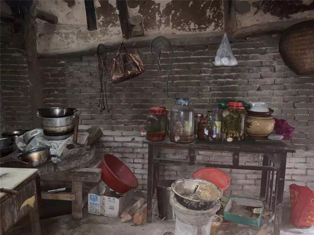 这是厨房的一角,一张老旧的木桌摆放着几个瓶瓶罐罐,旁边的泡菜坛子里腌制的泡菜是老人家每天主要的下饭菜。