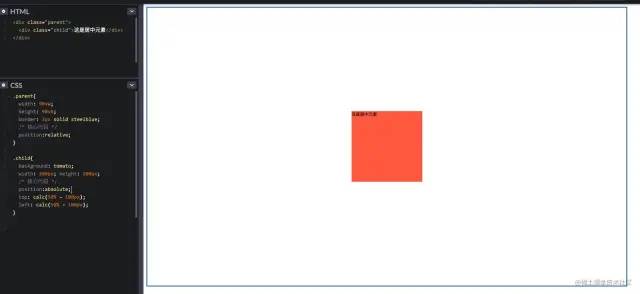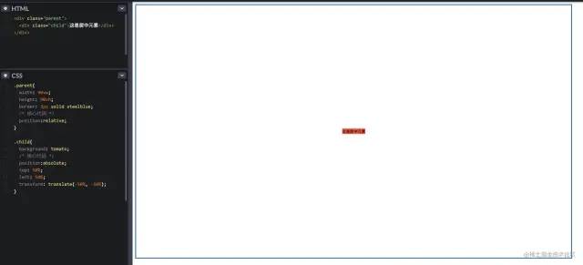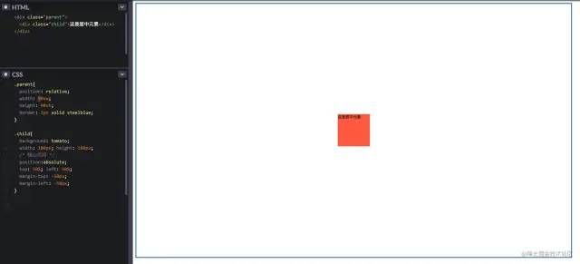 利用绝对定位百分比 50% 来实现,因为当前元素的百分比是基于相对定位(也就是父元素)来定位的;