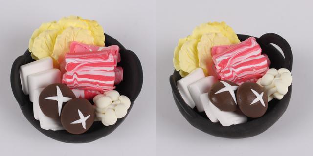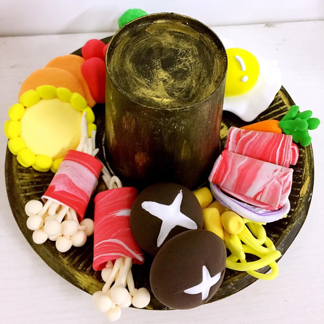 寿喜锅怎么能少了牛肉呢?把白色粘土和红色粘土掺在一起,稍微揉几下,然后擀成薄片,切成长条状,如上图所示,这就是牛肉啦!把它们卷成一卷,牛肉卷就做好了。