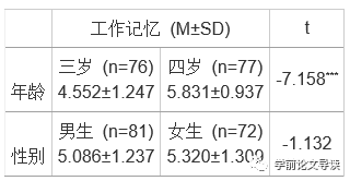 表1 幼儿工作记忆水平年龄、性别差异统计表