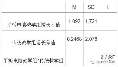 表3 平板电脑教学组和传统教学组后测的增长差值差异检验结果