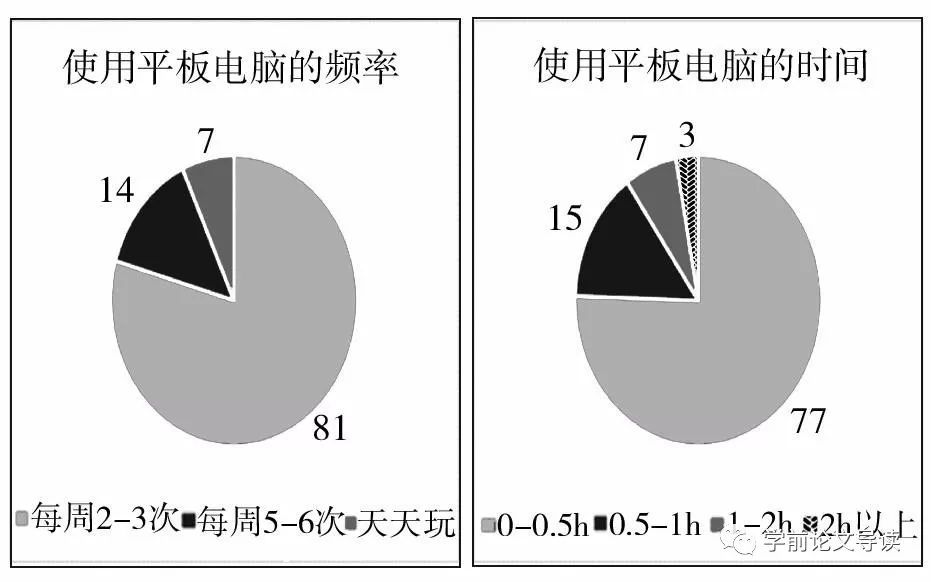 由图1可知, 每周在家庭中使用平板电脑频率为2—3次的幼儿共81名, 占使用平板电脑幼儿总人数的79%,使用频率为4—6次的幼儿共14名, 占使用平板电脑幼儿总人数的14%, 每天都使用平板电脑的幼儿共7名, 占使用平板电脑幼儿总人数的7%;在使用平板电脑的102名幼儿中, 每次使用平板电脑的时间在半个小时以内的幼儿共77名, 占使用平板电脑幼儿总人数的75%,每天使用平板电脑的时间在30分钟至1个小时之间的幼儿共15名, 占使用平板电脑幼儿总人数的15%,每天使用平板电脑的时间在1个小时至2个小时之间的幼儿共7名, 占使用平板电脑幼儿总人数的7%,每天使用平板电脑的时间在2个小时以上的幼儿共3名, 占使用平板电脑幼儿总人数的3%。