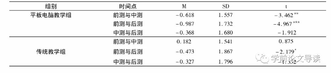 (四) 平板电脑教学组和传统教学组幼儿前、中、后测成绩差异分析