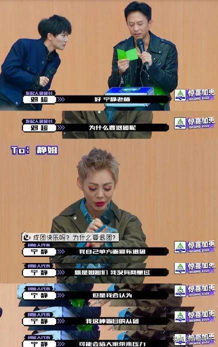 但更尴尬的是宁静作为团长在公布第六场公演观众投票时,不时转头询问导演,然后在主持人杨澜和黄晓明的提醒之下,执意要把415票说成415万票,也是让现场顿时陷入尴尬。