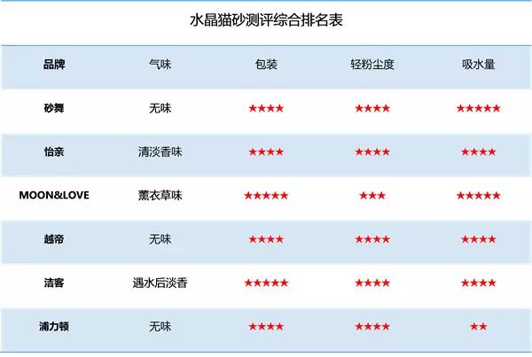 以上排序均按照星级总数排序,铲屎官如果在猫砂选择上有侧重关心的方面,可选择相应方面星级较高的猫砂。比如,最关心的是以上几款松木猫砂的气味,那就可以选气味最轻的喵仙儿或emily pets;如果想选一款更换周期比较长的水晶猫砂,那就可以选择吸水量比较多的砂舞、MOON&LOVE。