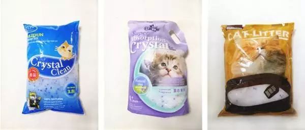 左:浦力顿水晶猫砂,3.8L ¥13.5,塑料包装