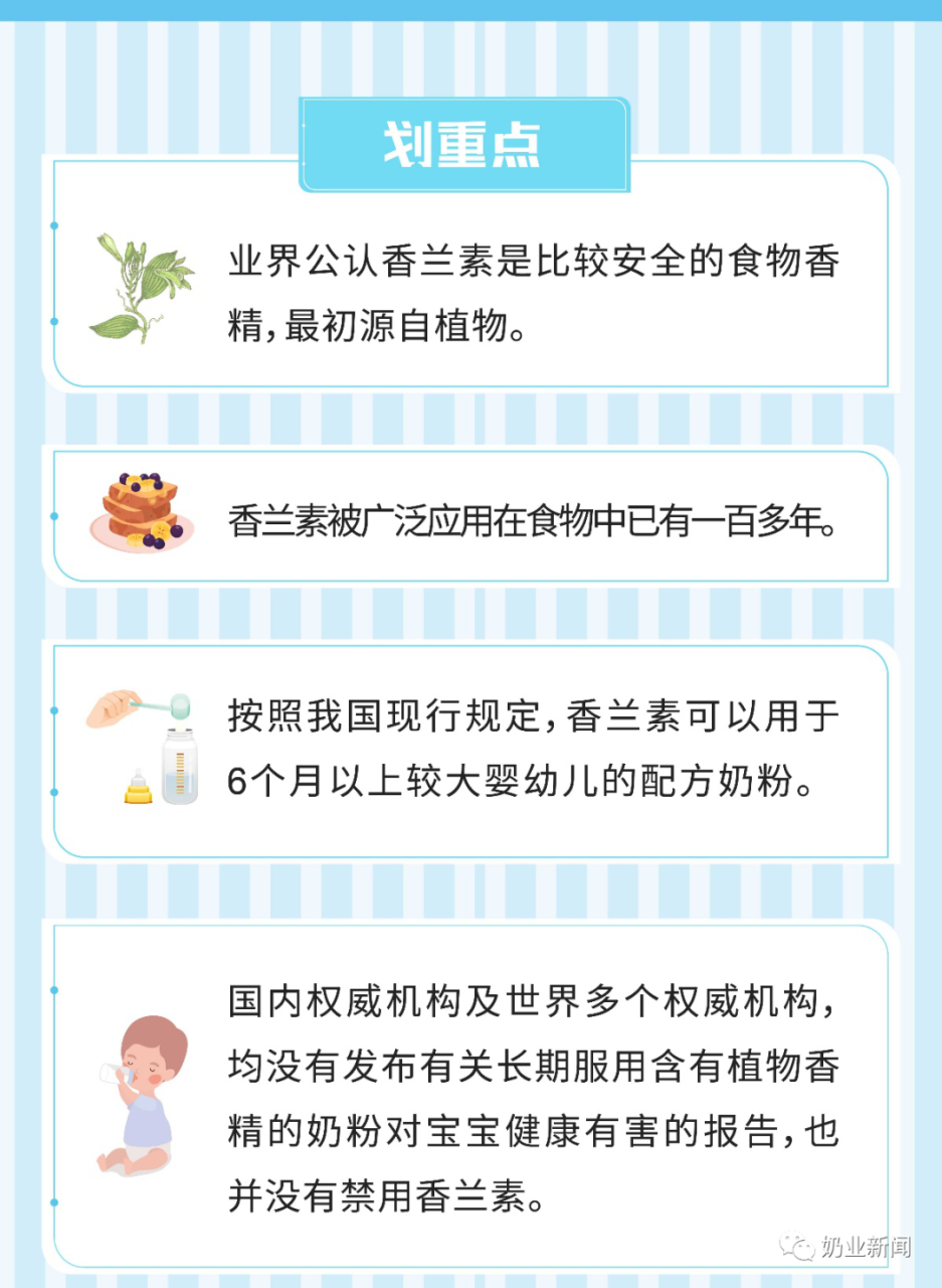 作为目前能够用于婴幼儿配方奶粉中的仅被允许的三种香精香料(香兰素、乙基香兰素和香荚兰豆浸膏提取物)之一,香兰素按照国家相关标准规定来使用,对宝宝来说,是相对安全的。