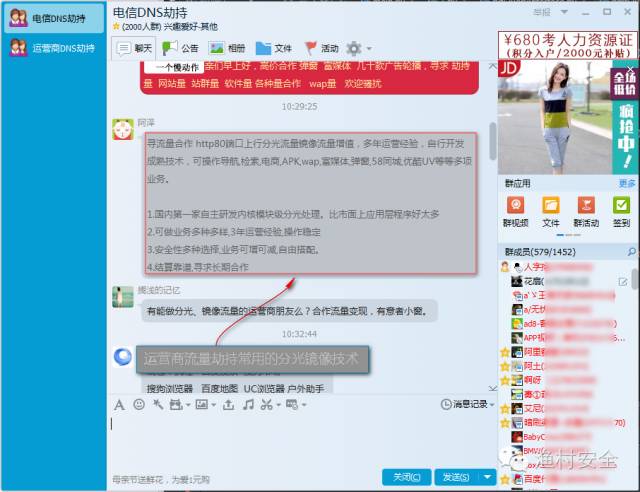 这个案例劫持代码中的域名“abc.ss229.com”归属于推广广告联盟,在安全论坛和微博已有多次用户反馈,其官网号称日均PV达到2.5亿。其实运营商劫持流量的买卖其实已是圈内半公开的秘密,结合对用户上网习惯的分析,可以实现对不同地区、不同群体用户的精准定制化广告推送,感兴趣的读者可以自行搜索相关的QQ群。