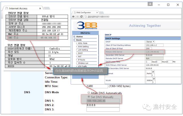 如下图中漏洞路由器首选DNS被设置为劫持服务器IP,备选DNS服务器设为谷歌公共DNS(8.8.8.8)。