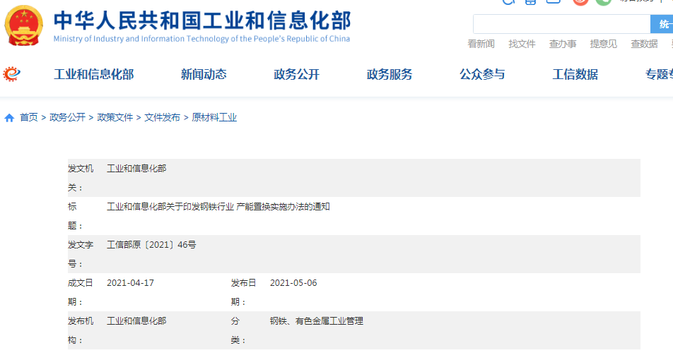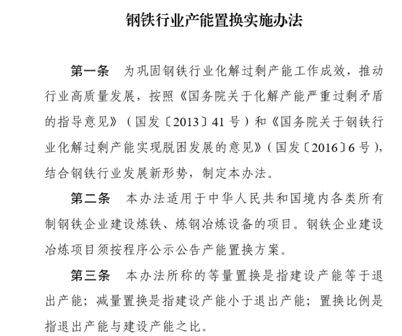 2013年10月,国务院出台《关于化解产能过剩严重过剩矛盾的指导意见》,提出钢铁行业严禁建设新增产能项目,项目建设须制定产能置换方案,实施等量或减量置换。2016年2月,国务院出台《关于钢铁行业化解过剩产能实现脱困发展的意见》,再次强调严禁新增产能。2016年工信部出台《钢铁工业调整升级规划(2016-2020年)》,提出各地一律不得净增钢铁冶炼能力,结构调整及改造项目必须严格执行产能减量置换。
