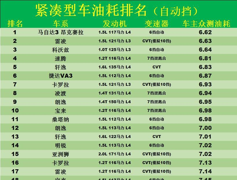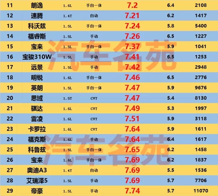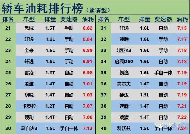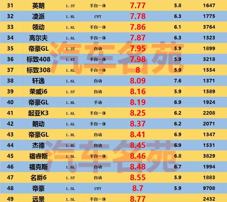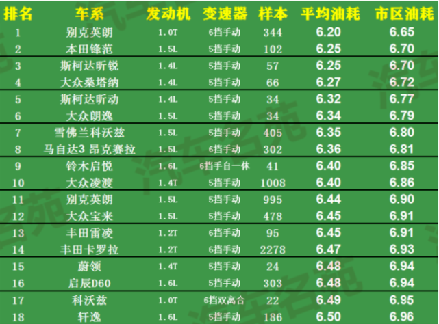 排名靠后的这20款车,大多数都是自动挡车型,或者是手动自动一体车型,我们都知道,自动挡的油耗一般要比手动挡高1-2L,而从数据上来看,手动自动一体车型也是比较耗油的,比如排名31位的别克英朗、排名33位的现代领动、排名41的起亚K3和排名第49位的吉利远景等等。官宣!轿车油耗排行榜更新!英朗、轩逸前10,朗逸第11,帝豪第29!