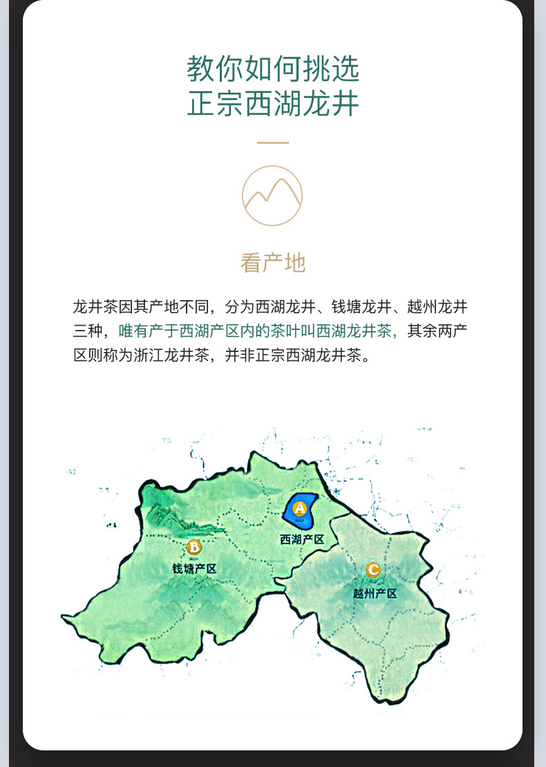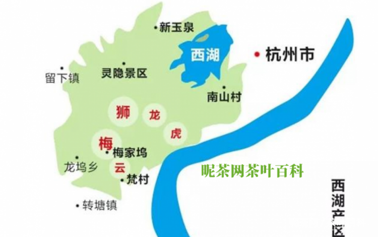 而为体现历史渊源和便于管理,龙井茶地理标志范围又分为三个产区:杭州市西湖区(西湖风景名胜区)为龙井茶西湖产区,杭州市下属的其余8个县(市、区)为龙井茶钱塘产区,绍兴市及磐安县、东阳市、天台县为龙井茶越州产区。