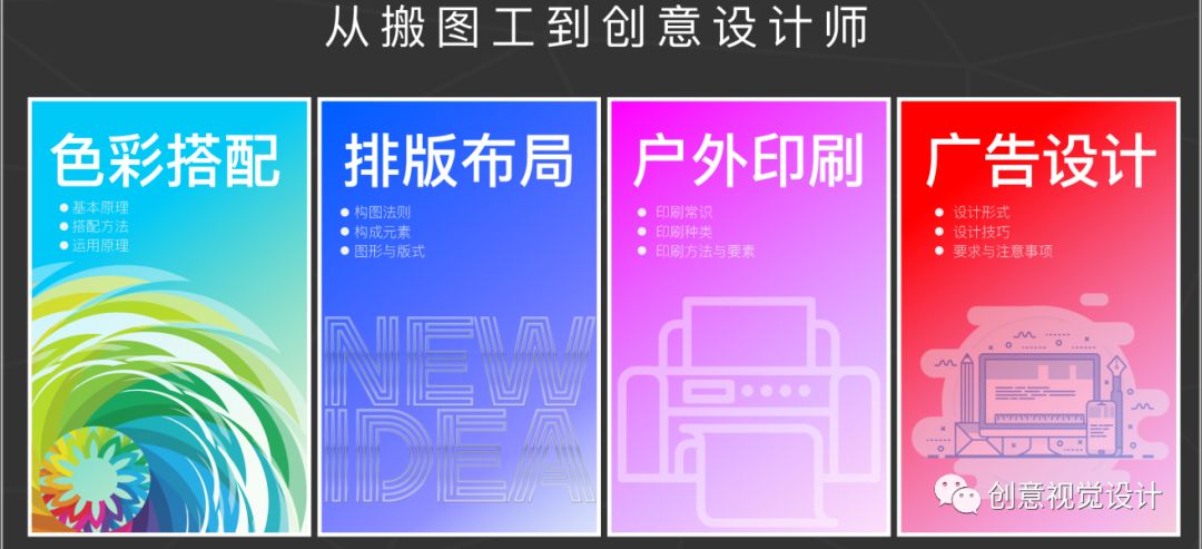 有了基本的操作能力,从初级操作员、搬图工上升到创意的平面设计师,你要懂得色彩搭配,排版布局,户外印刷,设计形式,广告设计,元素运用等,不要再去素材网上下模版修改,而是实实在在的自己原创。