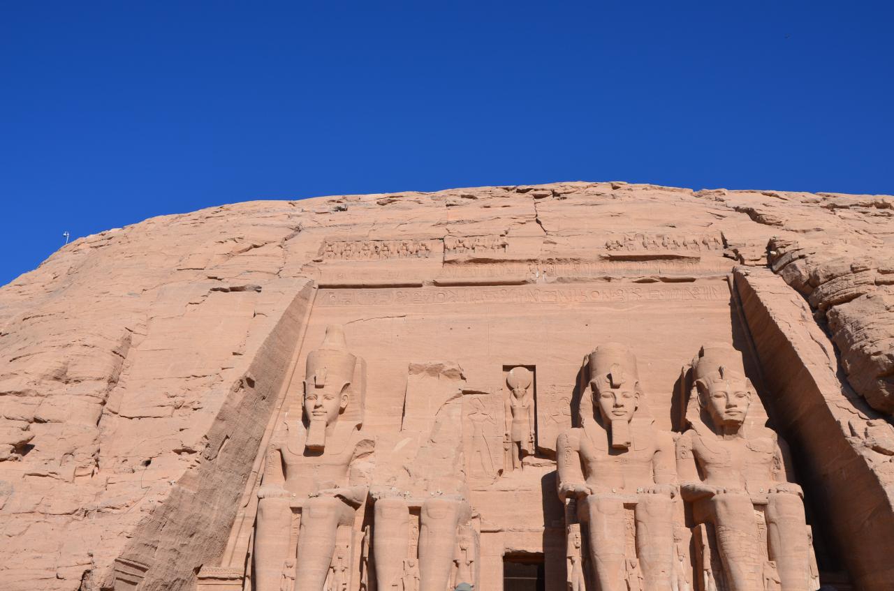 阿布辛贝神庙的建筑方式,区别于古埃及随处可见的金字塔,也绝对不是巨石简单堆砌的建筑物。在古埃及的建筑中,能够采用人工劈凿方式构建的建筑物,阿布辛贝神庙堪称唯一。据考古专家称,阿布辛贝神庙庙高30米,宽36米,纵深60米,门前4座巨型石质拉美西斯巨型坐像,每尊高20几米,重1200余吨,巨像的旁还精心策划且有序的散落着其母、妻、子女的小雕像,无论是身形还是神态都显得栩栩如生。即使是历经了三千多年的风风雨雨仍完好无损,由此可见其石质之坚硬,着实令人惊艳不已。