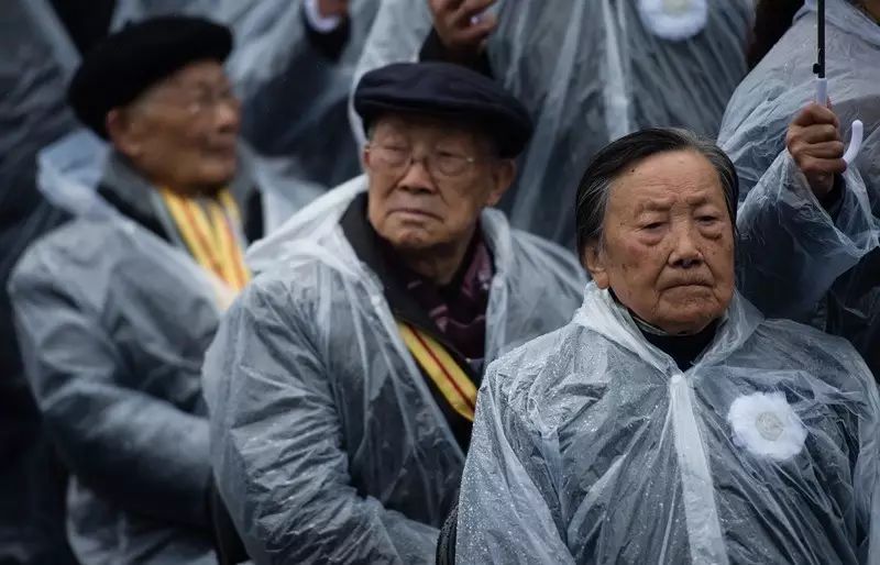 ▲南京大屠杀幸存者夏淑琴(右一)和抗战老兵等参加公祭仪式。 新华社发