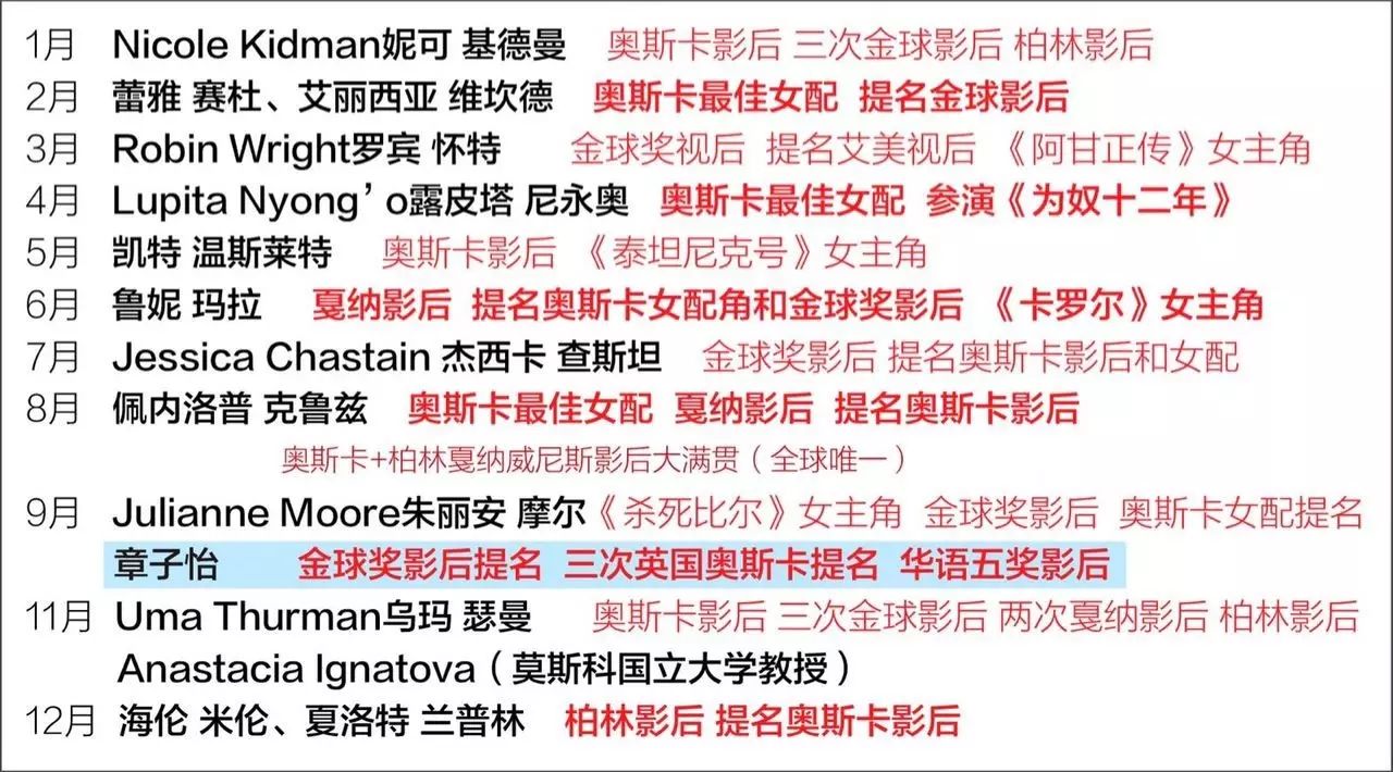 与之同名的各个都是响当当的国际影后,Kate Winslet、Nicole Kidman、Penélope Cruz、Jessica Chastain、Helen Mirren等等。章子怡征战主流国际电影奖项的战绩放在其中也不落人后;