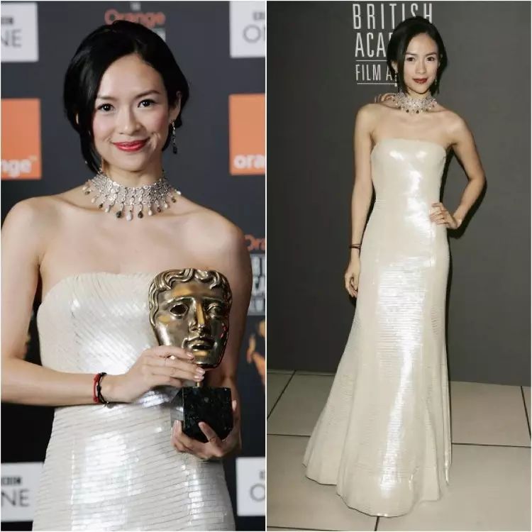 她曾三次提名英国奥斯卡BAFTA,两次最佳女主(《艺妓回忆录》和《十面埋伏》),一次女配(《卧虎藏龙》)。这条裹身的裸色长裙她穿得非常出彩,身材凸显得格外曼妙,质感也很高级。