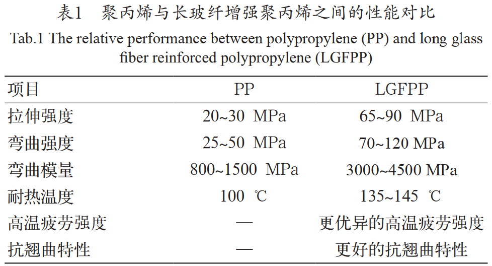 长玻纤增强聚丙烯是采用长度为 10~25 mm的玻璃纤维与基体树脂进行复合而形成的改性聚丙烯复合材料,与普通聚丙烯材料相比,通过玻璃纤维增强的聚丙烯的机械性能能够得到成倍甚至数倍的提高,能够与ABS塑料的相关产品相媲美。