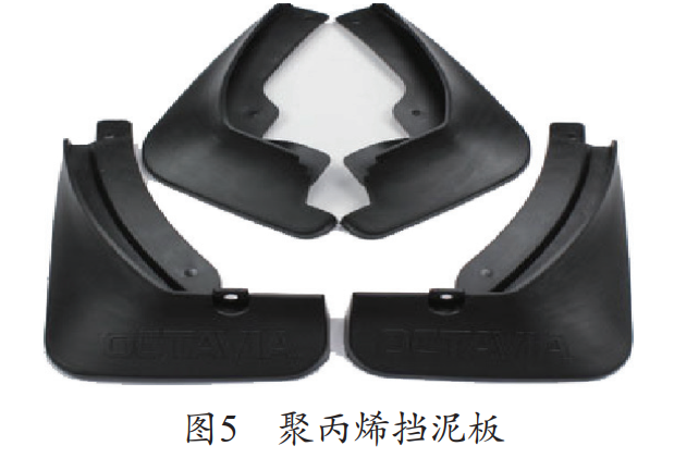汽车挡泥板的主要作用是防止在行车过程中泥土溅到车身、拉杆、球头上。当泥土飞溅到挡泥板上时,则容易引起生锈,并且在外力冲击时挡泥板容易被破坏。采用聚丙烯或改性聚丙烯材料用于挡泥板,由于聚丙烯柔软、耐冲击、耐腐蚀的特点,挡泥板用聚丙烯材料可以有效防止生锈,保持挡泥板的美丽外观。另外,外力冲击时容易引起变形,不容易直接毁坏部件,如图5所示。