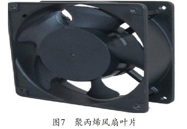 汽车发动机的冷却风扇叶片是保证汽车发动机使用寿命的关键构件。风扇叶片的质量直接影响发动机的冷却效果和工作噪音的大小。聚丙烯风扇叶片具有重量轻、噪音低、寿命长等优点,并且叶片形状可以通过注塑成型制成各种有利于空气流动的飞机机翼形。因此,聚丙烯塑料成为汽车发动机风扇压片的首选塑料材料,如图7所示。