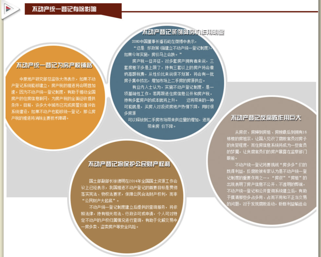 从长期来看,不动产统一登记是可以对房价上涨起抑制作用的。不少房地产人士表示,不动产登记的出台再辅以住房信息公开和房产税开征,持有多套房产的成本就将上升,这将抑制人们买房的热情并促使房产持有人减持房产,进而带来房价下降,从而带动二手房市场的繁荣。