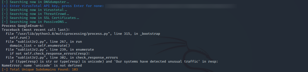 刚开始是在kali中安装的,运行时中间会报一段异常,但不影响结果的输出,异常提示的是googleenum,是因为无法访问谷歌造成的。