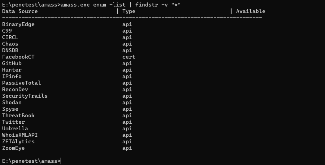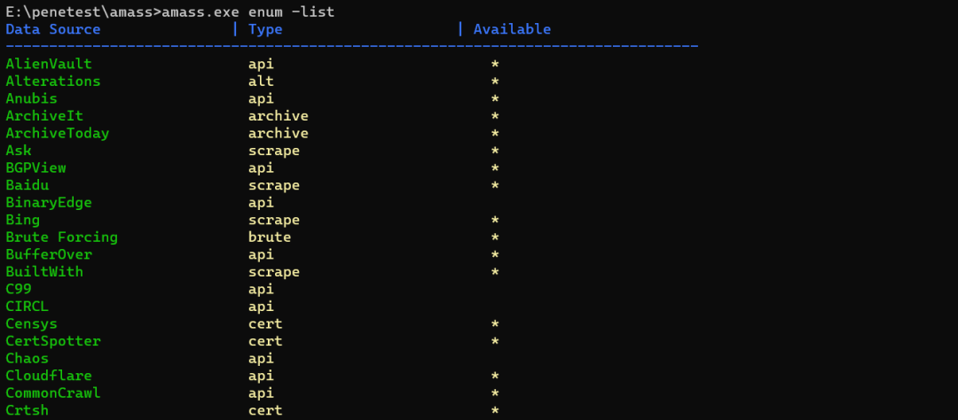 为了更好的发掘下这个工具对子域名搜集的能力,这里决定配置下key重新尝试,首先查看amass enum所支持的数据源: