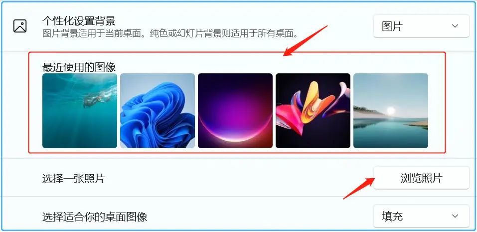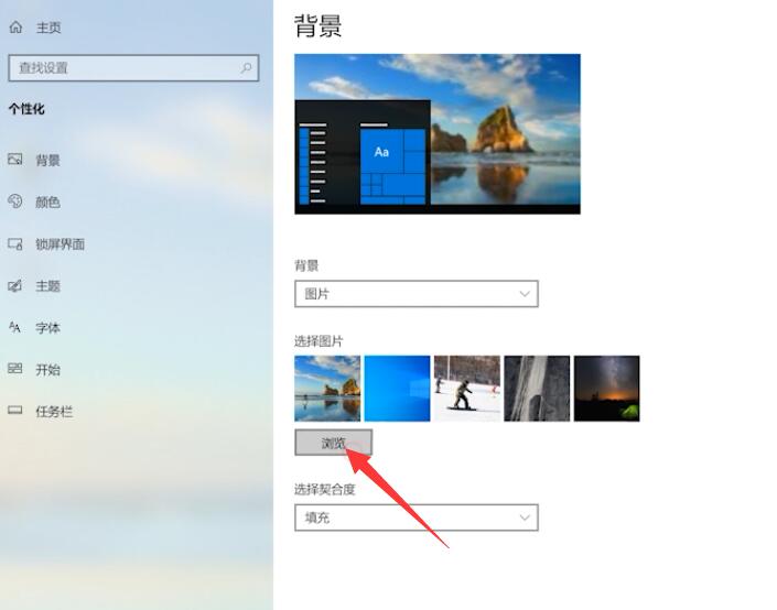 3.在背景设置窗口中,选择一张系统自带的图片或者点击右下角的浏览图片,选择自己一张喜欢的图片即可!