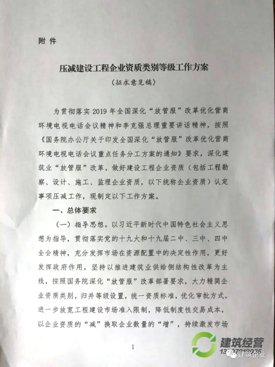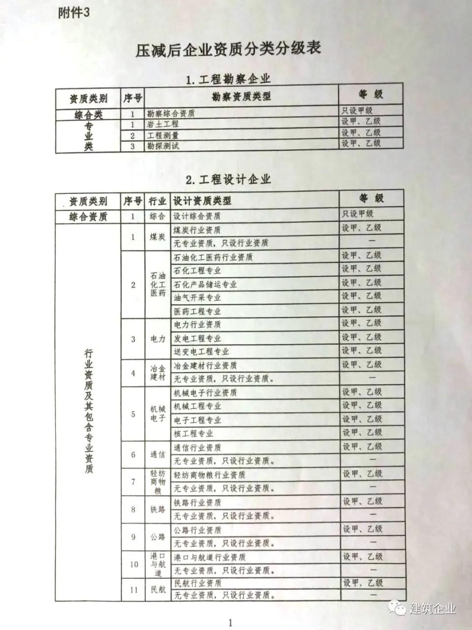 1、进一步加大放权力度,除综合资质外企业资质等级,全部下放至省级及以下有关主管部门审批(公路、铁路、水运、民航、水利,通信等资质审批权限由国务院有关主管部门根据实际情况决定)