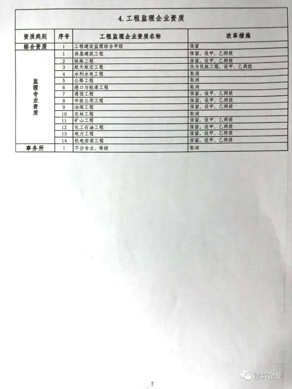 5、工程监理资质。保留综合资质,可承担各类工程监理业务,规模不受限制;取消专业资质中的水利水电工程、公路工程、港口与航道工程、农林工程资质,保留其余10类专业资质,取消事务所资质。综合资盾只设甲级。专业资质等级压减为甲、乙两级。改革后,工程监理资质类别和等级由34个压减为21个,压减38%。