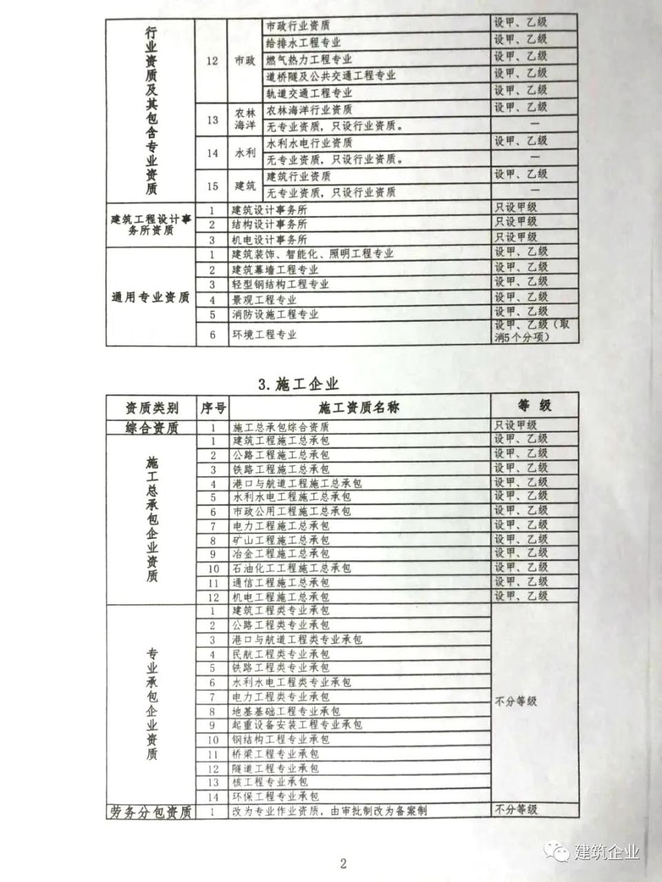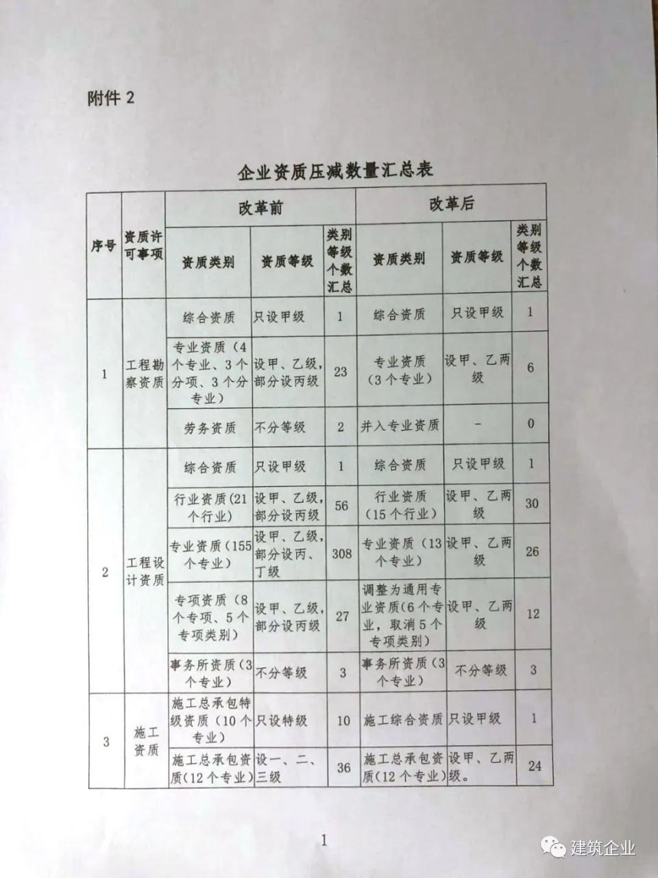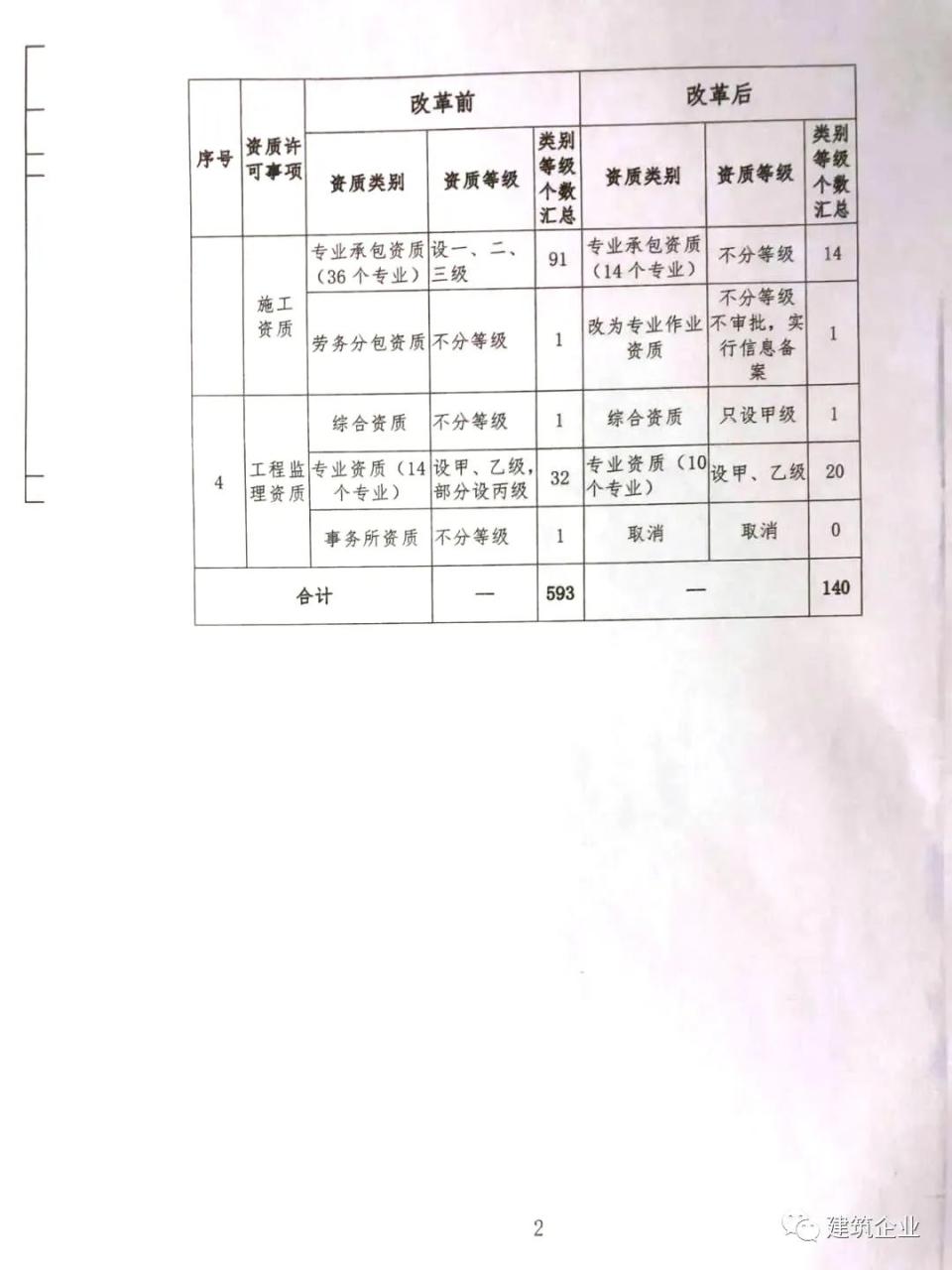 2、施工资质。将施工总承包企业特级资质改为施工综合资质,可承担各行业、各等级施工业务;保留12类施工总承包资质;将36类专业承包资质整合为14类;将劳务企业资质改为专业作业资质,由审批制改为备案制。综合资质只设甲级,施工总承包资质等级压减为甲、乙两级,专业承包资质和专业作业资质不分等级。改革后,施工企业资质类别和等级由138个压减为40个,压减71%。