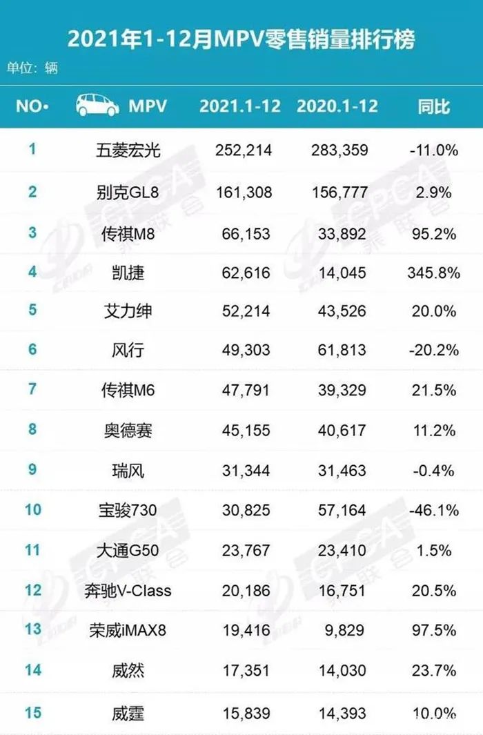 2021年已经过去了一段时间,汽车市场各个细分领域的销量成绩基本也都相应出炉mpv销量排行榜,新能源汽车成为了最大赢家。而在“二胎”、“三胎”政策刺激下的MPV市场到底表现如何?这应该也是很多小伙伴比较关心的问题。从乘联会公布的2021年全年销量数据看,1-12月乘用车共计销售2014.6万辆,同比增长4.4%。MPV车型2021全年累计销量为107.9万辆,同比下降了1%。