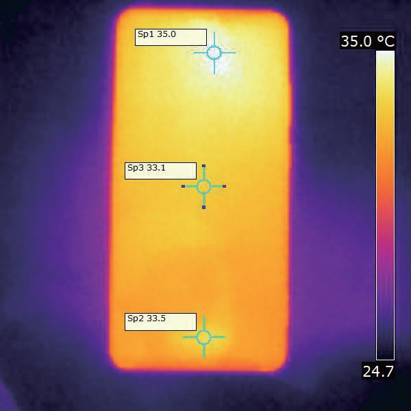 ▲从温度图上可以明显看出,荣耀Note10在经过1小时游戏后的机身最高温度仅为35℃,其液冷散热相当有效。