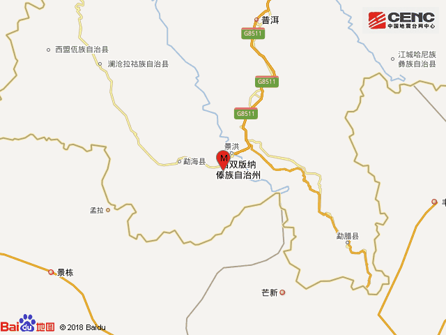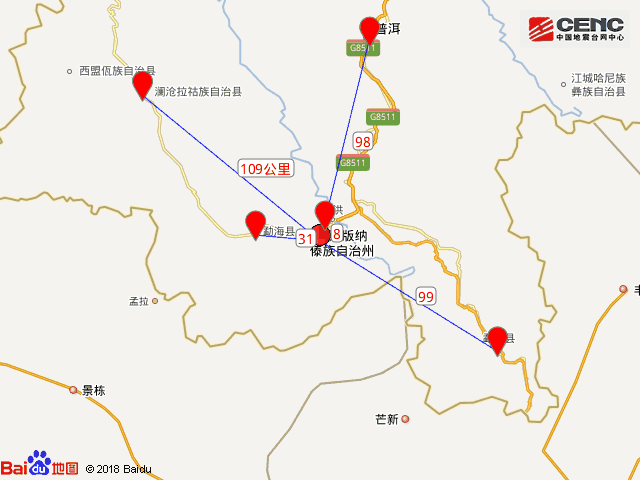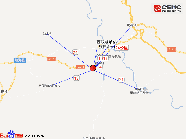 震中距景洪市8公里、距勐海县31公里、距思茅区98公里、距勐腊县99公里、距澜沧拉祜族自治县109公里,距西双版纳傣族自治州10公里,距昆明市400公里。