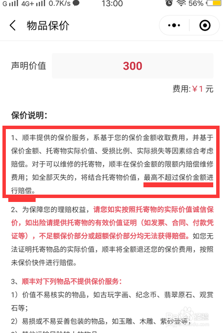 以一件物品价值1000元的物品为例,选择保价1500元或者更高的金额,消费者获得的最高赔偿则为货物实际价值1000元;如果只选择保价800元,损坏的部分价值500元,赔偿金额可能就是500*(800/1000)=400元;如果没有选择保价,以运费为30元为例,1000元的物品全部丢损最多只能赔偿运费3倍以内的费用,即90元以内。